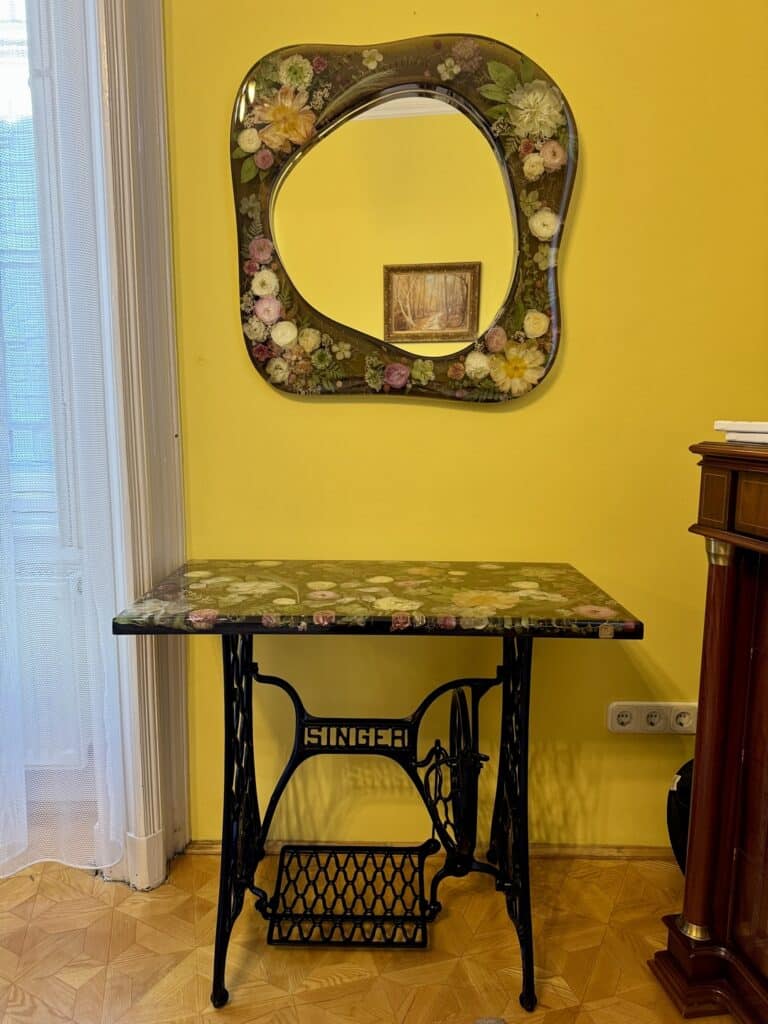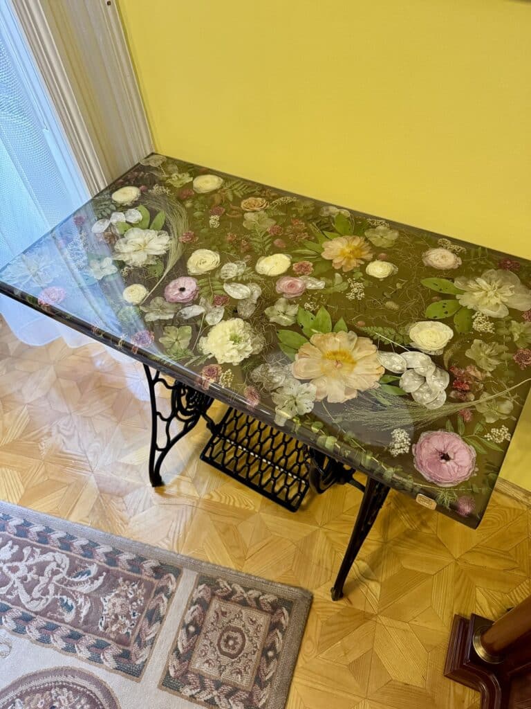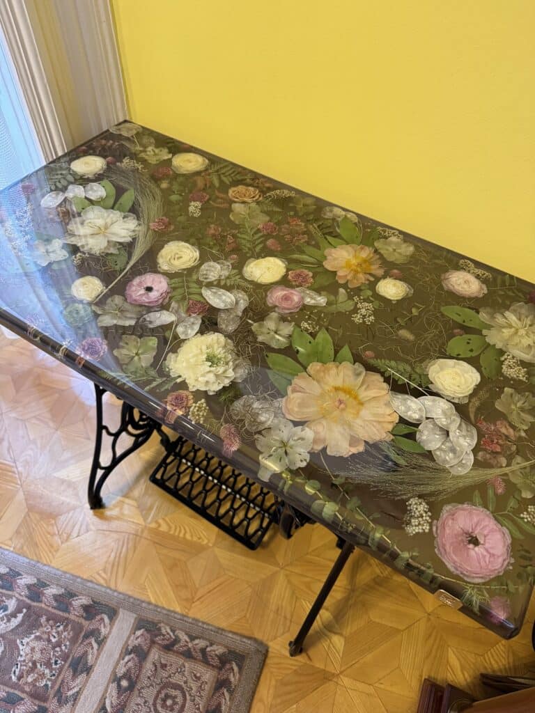 A megrendelő a Construma OtthonDesign kiállításon szeretett bele a munkáimba, amikor meglátta a standomnál kiállított régi Singer varrógépből készült epoxi asztalt. Ott, élőben találkozott először ezzel a technikával és az általam megálmodott virágos világ hangulatával. Pár héttel később már közösen ötleteltünk, hogyan lehetne egy hasonló asztalt készíteni az ő otthonába – egy régi családi Singer felhasználásával.
