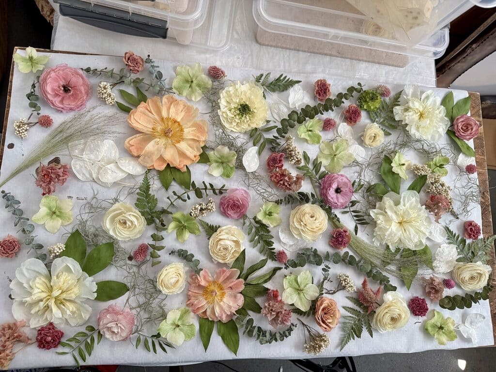 Az epoxi asztal és tükör tervezésénél külön kritérium volt a virágok összeválogatása, melyet a pasztell árnyalatok és szürke pigment pünkösdi rózsa, rózsák, boglárka és – a megrendelő kérésére – hunyor került kiválasztásra. Ezek nemcsak színekben, hanem jelentésükben is szépen kiegészítik egymást. Nem volt minden virág a műhelyben leszárítva, ezért a hiányzókat a piacon szereztem be, majd szilikában szárítottam ki. Ez egy kb. négyhetes folyamat, de érdemes kivárni – így lesz igazán szép és tartós a végeredmény. * A virágok szárításának folyamatáról egy korábbi posztomban olvashatsz.