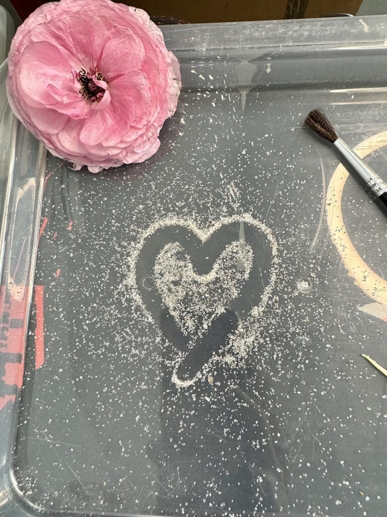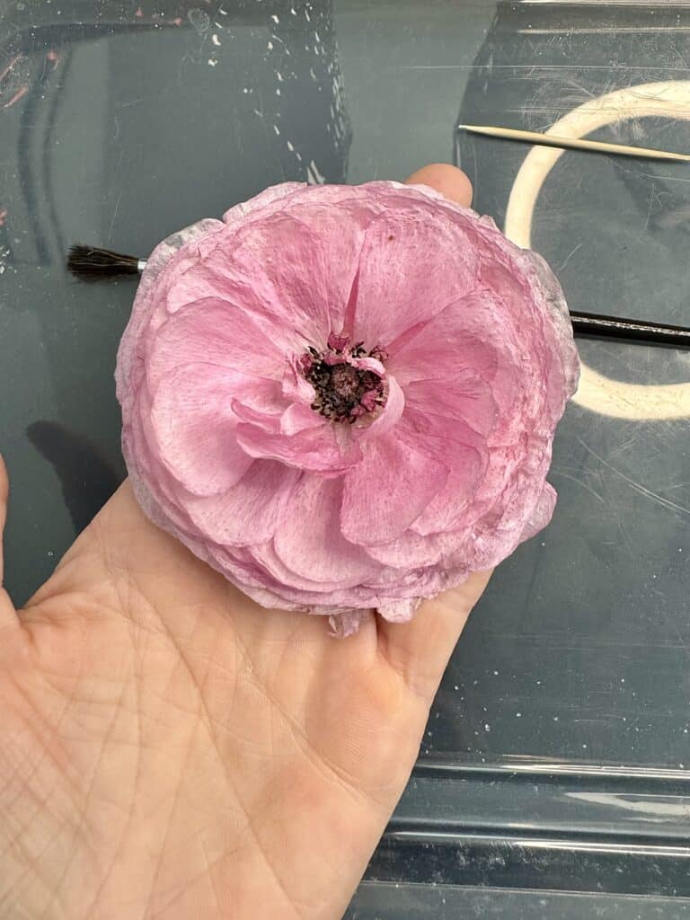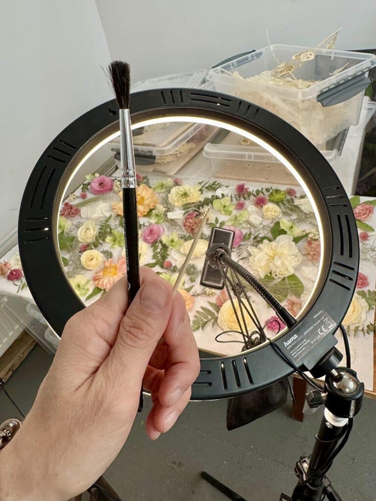 Amint elkészült az asztallap kerete, kezdődhetett a szárított virágok alapos megtisztítása a szilikakristályoktól. Ez minden alkalommal aprólékos és türelmet igénylő munka, de számomra ez az egyik legnyugodtabb része a folyamatnak – ilyenkor teljesen bele lehet merülni az alkotásba egy kellemes zene mellett.
