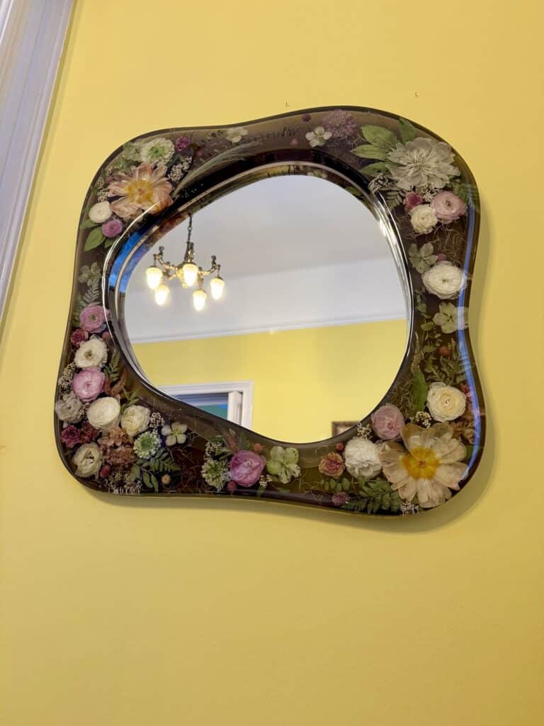 Miután minden virág a helyére került, megérkezett a gyanta, és kezdődhetett az öntés, amely 5 napig tartott és egy hétre rá pillantottam meg, hogy mit is alkottam, hiszen az öntéseim 90%-át fordítva készítem. Ez mindig egy izgalmas pillanat, amikor az elképzelt kompozíció végre testet ölt és szembesülök a végeredménnyel. Az öntés után már látszott, hogy különleges darab született. Erről videó is készült a social média felületeimen. ( Facebook, Instagram, TikTok )
